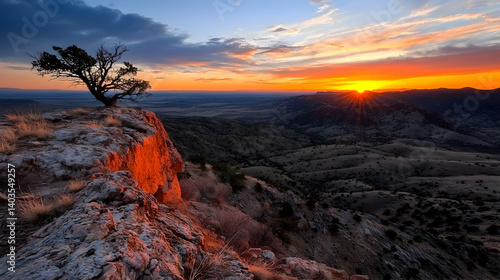 © Sujito, Naklejka premium Dramatic Sunset Over Rocky Hilltop Viewpoint