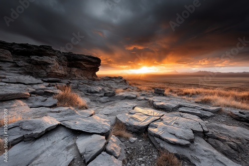 © milenialdesastudio, Obraz premium Dramatic sunset over rocky landscape.
