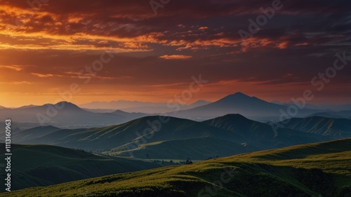 © Syarif, Fototapeta premium Dramatic sunset over rolling hills and mountains.
