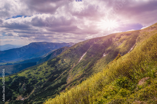 © valerii kalantai, Fototapeta premium dramatic sunset over the mountain top. cloudy pink sky before twilight.