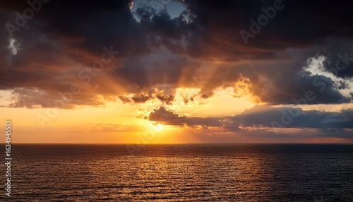 Obraz premium dramatic sunset over the ocean with dark clouds and rays of light...