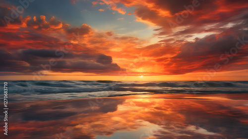 © unairakstudio, Naklejka premium Dramatic sunset over the ocean, with fiery clouds reflecting on the water's surface, creating a breathtaking scene.