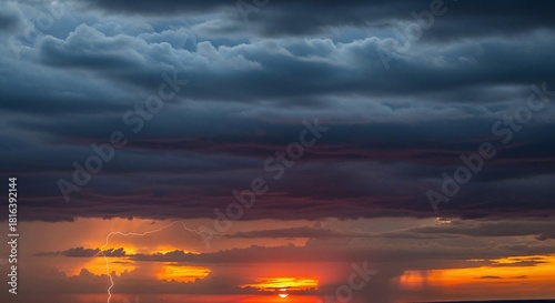 © MdRiaz, Fototapeta premium Dramatic sunset over water with dark storm clouds and a lightning strike