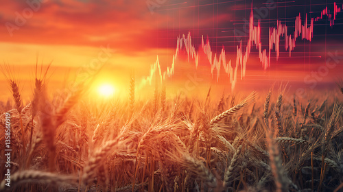© Aka, Fototapeta premium Dramatic Sunset Over Wheat Field with Declining Financial Chart Showing Market Crisis