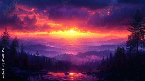 © harryaishi, Fototapeta premium Dramatic sunset rain over misty mountains.