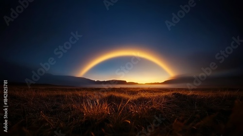 © aulaiphon, Obraz premium Dramatic sunset rainbow over serene landscape nature photography captivating viewpoint of rural tranquility