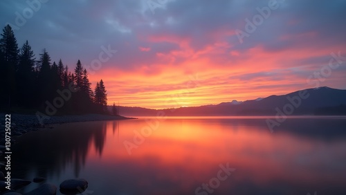 © mukuro, Fototapeta premium Dramatic Sunset Reflecting on Calm Lake with Mountains and Silhouette of Trees in Background