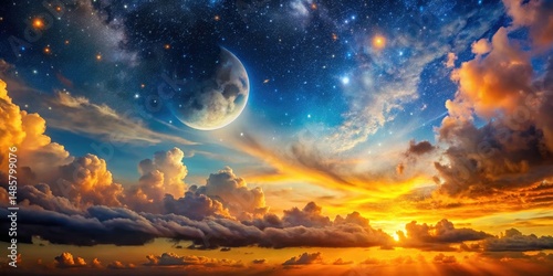 Fototapeta premium Dramatic Sunset Sky, Bokeh Night Moon, Starry Nature Background, Gold Orange Hues, Cloudy Atmosphere
