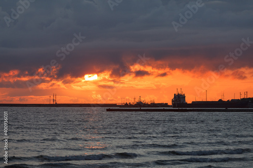 © Mykola Iegorov, Fototapeta premium Dramatic sunset sky over the sea and the pier.