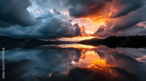 © Fonlinepix, Fototapeta premium Dramatic sunset sky reflecting on clouds above the mountains.