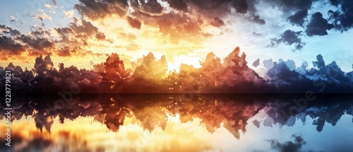Fototapeta premium Dramatic Sunset Sky Reflection Colorful Cloudscape Over Calm Water