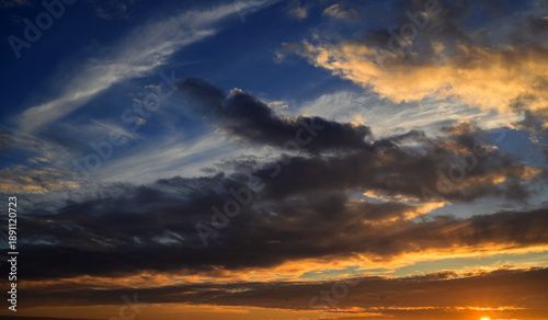 Fototapeta premium Dramatic sunset sky with golden clouds and deep blue twilight.