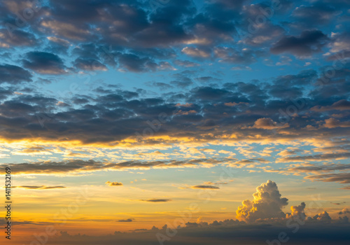 Fototapeta premium Dramatic Sunset Sky with Golden Cloudscape and Cumulus Clouds: Aerial View