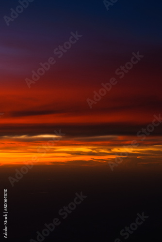 Fototapeta premium Dramatic sunset sky with orange red and blue shades. Aerial sunset landscape photo.