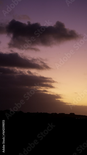 © belavinstock, Naklejka premium Dramatic sunset sky with purple and orange hues over dark cloud silhouette