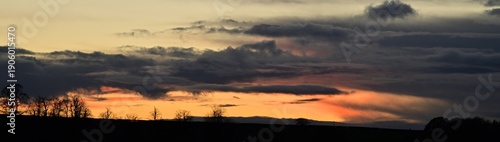 Fototapeta premium Dramatic sunset sky with silhouetted leafless trees along horizon