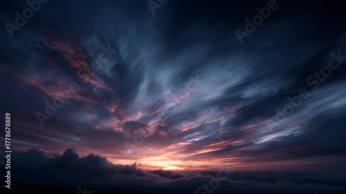 Obraz premium Dramatic sunset sky with swirling clouds in vibrant hues veiled by...