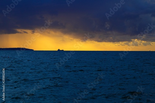 © Elena Sistaliuk, Fototapeta premium Dramatic sunset through a cloudy dark sky over the ocean.
