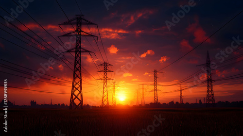 © PYP STOCK, Fototapeta premium Dramatic Sunset with Silhouetted Power Lines and Towers in Rural Landscape