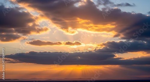 © Makhjum Hossain , Obraz premium Dramatic sunset with sun rays shining through clouds in the sky