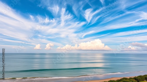 © TanoyChakraborty, Obraz premium "Dramatic Swirling Cloudscape Above Tranquil Ocean Under Clear Blue Sky"