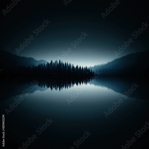 © zacty6, Fototapeta premium Dramatic Symmetrical Landscape of Dark Forest Silhouette Reflected in Still Water with Mist