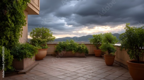 Naklejka premium Dramatic terrace view with potted plants and vines under stormy dawn clouds