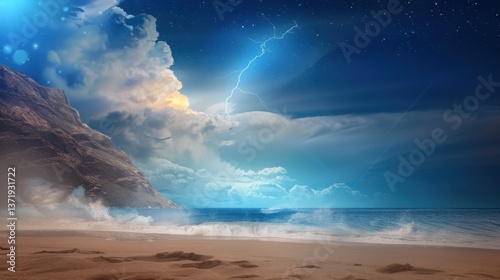 © Jang, Naklejka premium Dramatic Thunderstorm Over Serene Beach at Night Under Starry Sky