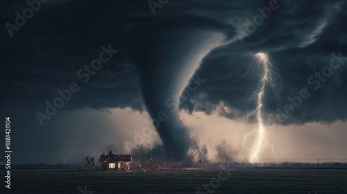 © jodoto, Obraz premium Dramatic Tornado and Lightning Display Over a Rural House: Nature's Fury Captured
