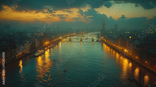 © MUHAMMADALAN, Obraz premium Dramatic twilight cityscape with river, bridges, and boats.