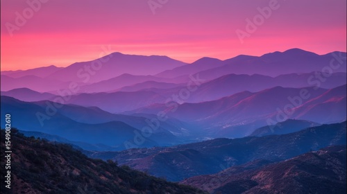 Fototapeta premium Dramatic twilight silhouette of a mountain range against a vibrant purple and pink sky