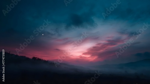 Fototapeta premium Dramatic twilight sky with crescent moon and misty landscape