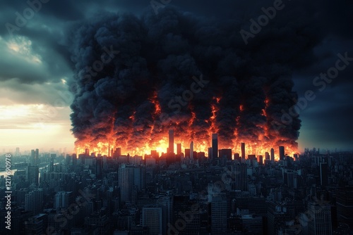 © Chaaim, Obraz premium Dramatic Urban Landscape with Fire and Smoke Over City Skyline