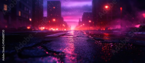 Obraz premium Dramatic urban road scene at dawn showcasing vibrant colors and reflections with a moody atmosphere and cinematic lighting effects.
