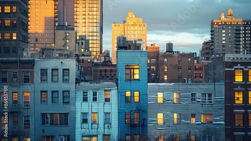 © Aeman, Fototapeta premium dramatic urban skyline at dusk, where the setting sun casts a golden glow on buildings with aluminum siding