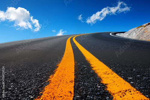 © wazamai, Naklejka premium Dramatic view of a curvy mountain road with vivid yellow stripes