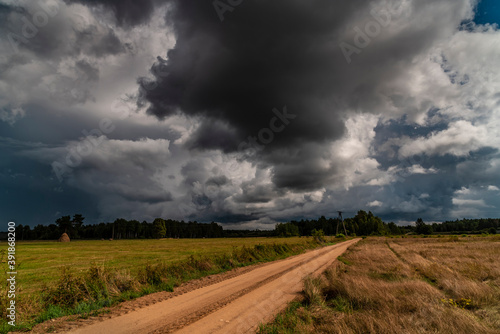 © hajdar, Fototapeta premium Dramatic view of a shelf cloud over a field, horizontal cloud formation, panorama view.