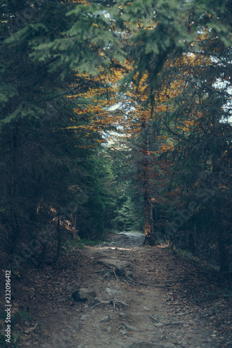 Obraz premium dramatic view of beautiful green forest in Carpathians, Ukraine