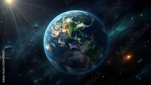 Fototapeta premium Dramatic View of Earth Surrounded by Asteroid Field in Space