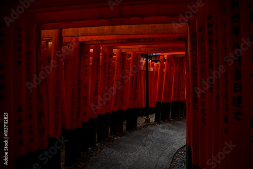© HO, Fototapeta premium Dramatic view of red gates "Torii", Fushimi Inari Taisha Shrine in Kyoto, Japan. About 1,000 torii gates line to fushimi inari-taisha. The Japanese text mean :bless you