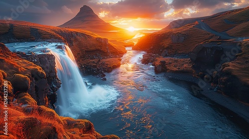 © sk, Fototapeta premium Dramatic view waterfall near mountain at sunset