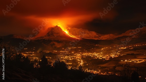© ADD PHOTO, Fototapeta premium Dramatic Volcanic Eruption Illuminating the Night Sky Over a Mountainous Landscape