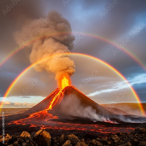 © Jovan, Obraz premium Dramatic Volcanic Eruption with Vibrant Double Rainbow in Iceland.