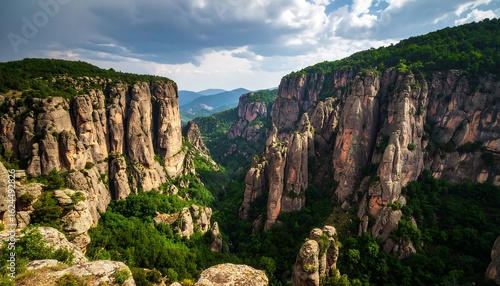 Naklejka premium Dramatic Vratsata mountain cliffs landscape with moody sky and green foliage