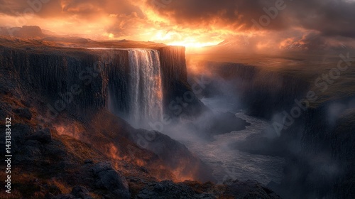 © IQBAL NURANTOKO, Fototapeta premium Dramatic waterfall cascading down cliffs at fiery sunset