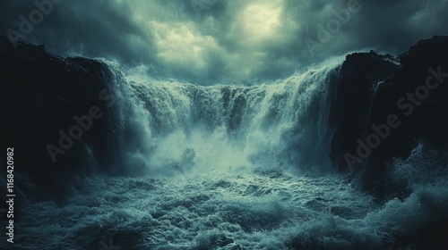 © jumino, Obraz premium Dramatic waterfall cascading over dark rocks under stormy sky.