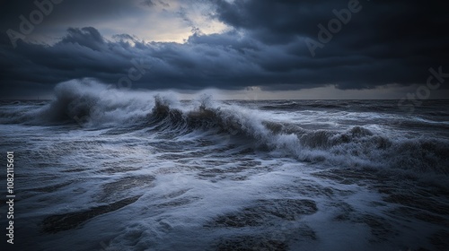 © Rere_Art151, Obraz premium Dramatic Waves Crashing Under Dark Storm Clouds