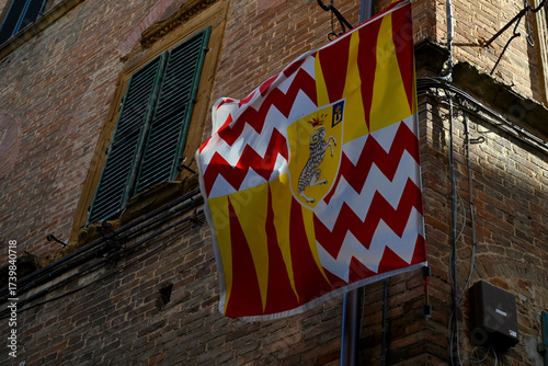 © Richard Villalon, Obraz premium Drapeau de quartier dans la ville de Sienne en gros plan