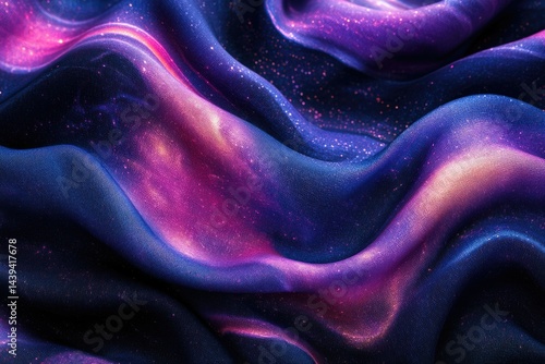 © Vibu design gallery, Obraz premium Draped fabric with galaxy print, shimmering with purple and blue hues.