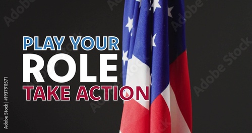 Fototapeta premium Draping United States flag vertical at studio art, showing bold PLAY YOUR ROLE headline, copy space